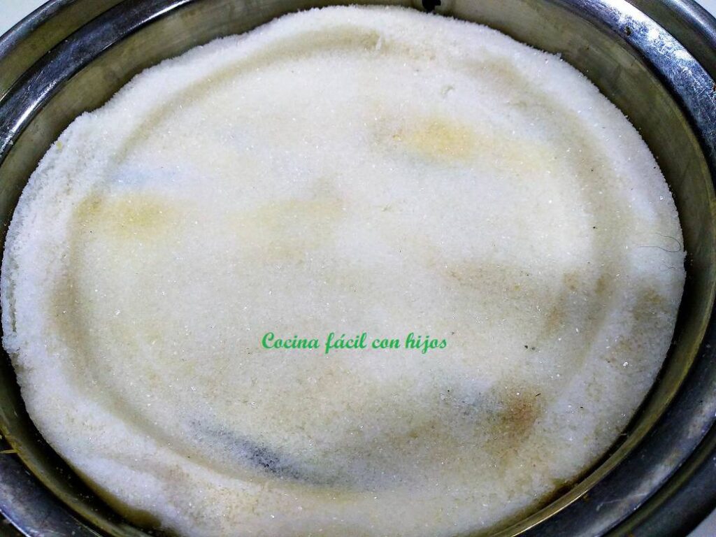 • A continuación, ponemos una primera capa de sal. Esta primera capa conseguirá dotar a la pieza de sal desde la parte inferior.