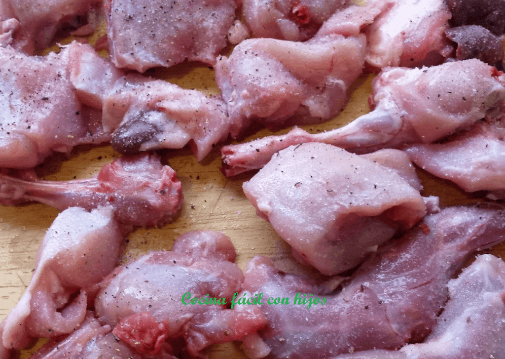 - Limpiamos el conejo y lo troceamos, en la mayoría de los comercios el conejo ya viene preparado de esta forma, o se encarga el carnicero que lo prepare.