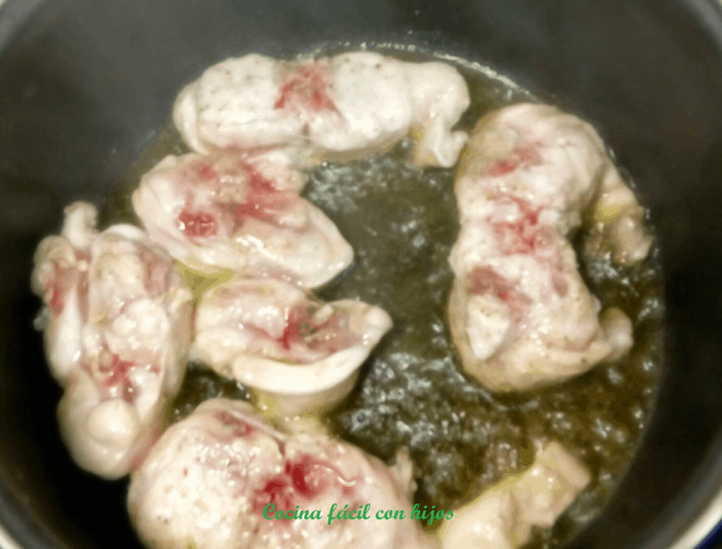 - Ponemos varias cucharadas de aceite de oliva en la paellera y freímos el conejo, hasta dorarlo por fuera. Lo sacamos y reservamos.