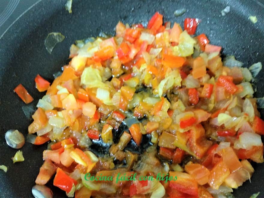 - Cuando está tierno incorporamos el tomate rallado y el ajo laminado. Y continuamos con el sofrito hasta que está bien hecho.