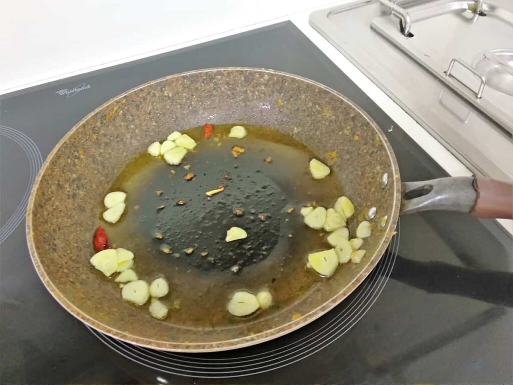 - Ponemos aceite en una sartén, el suficiente para cubrir los ajos laminados. Añadimos los ajos y los dejamos al fuego medio bajo removiendo de vez en cuando los ajos, para que se hagan por todas partes. añadimos las cayenas. Cuando están listos, sacamos los ajos y las cayenas y reservamos. Ya tenemos el aceite aromatizado.