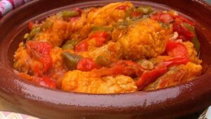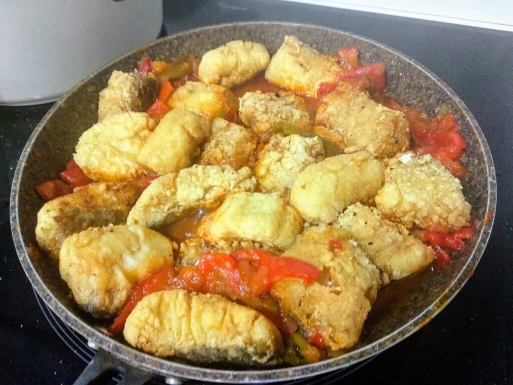 Es un plato muy sencillo, que consiste en bacalao desalado cocinado con verduras, aceite de oliva y ajo.