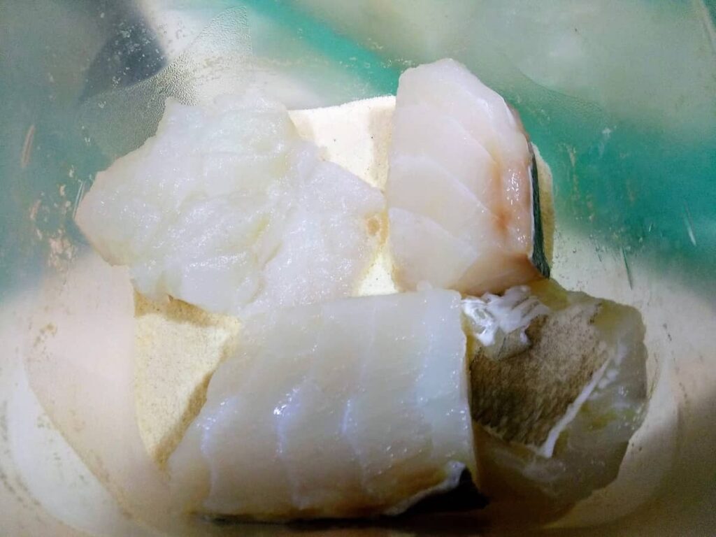 - Rebozamos el pescado con harina de fritura. Para rebozarlo tengo un truco pongo la harina en un táper, añado el pescado en tandas, cierro el táper y lo sacudo. El bacalao coge la harina justa para que nos quede perfecto y sin grumos.