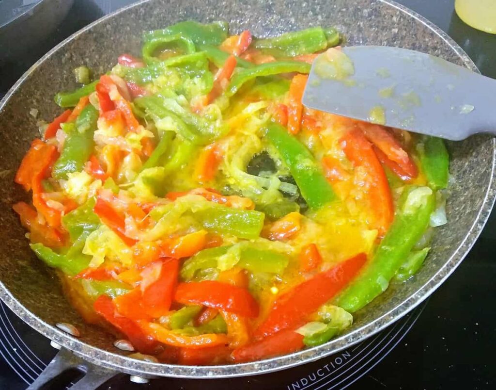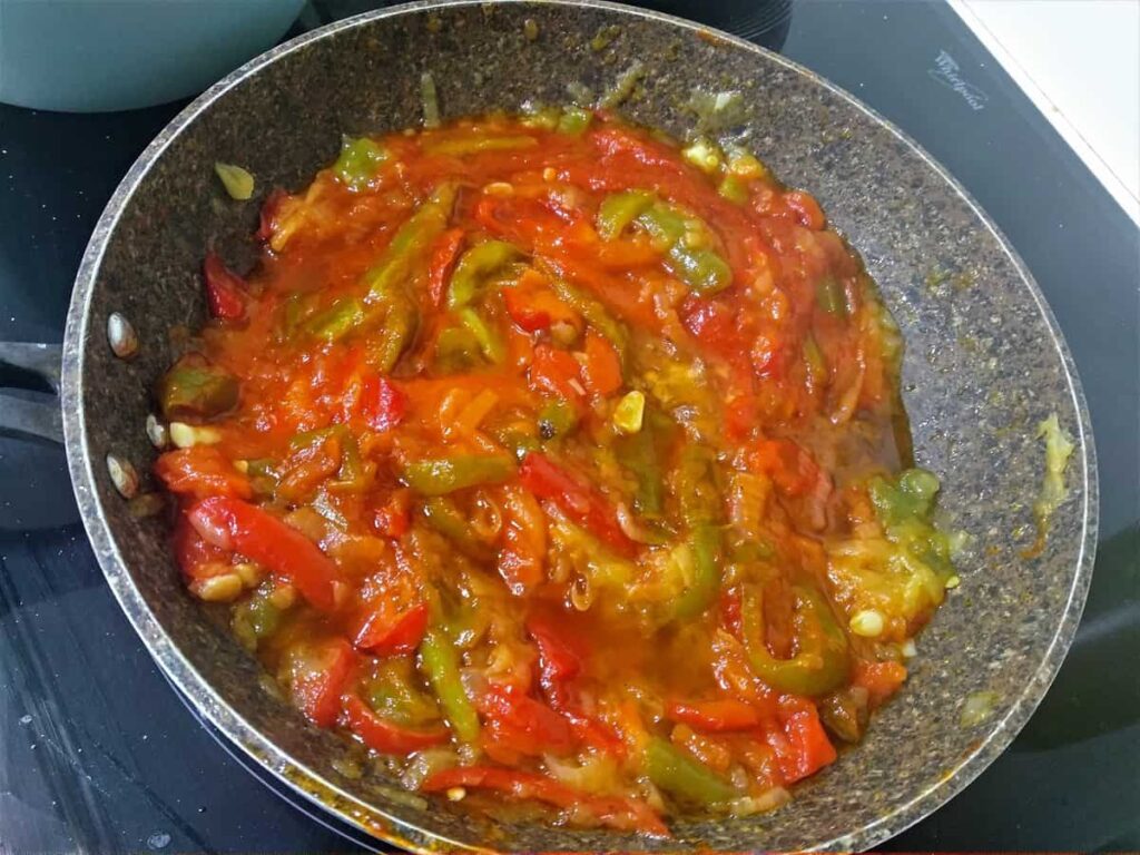 En esta receta que os presento, utilizamos: cebolla, pimientos rojos y verdes en crudo, ajos y pimiento morrón.