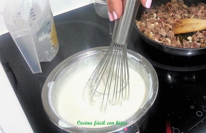 • Añadimos la leche templada y la nuez moscada, batiendo constantemente con un batidor manual.