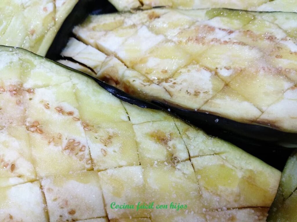 • Damos unos cortes en la carne de la berenjena sin llegar a la piel (tal como veis en la foto),