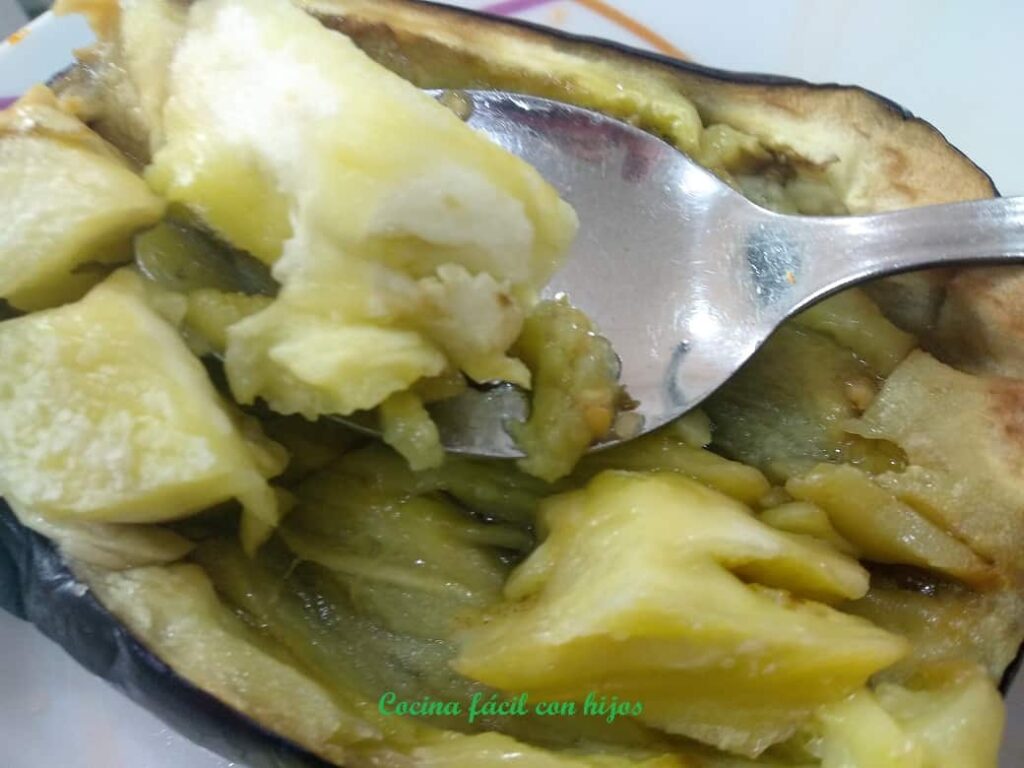 • Retiramos la carne de la berenjena con ayuda de una cuchara y con cuidado de no quemarnos, manteniendo la cáscara intacta. Al estar parcialmente horneada, se separa con mucha facilidad.