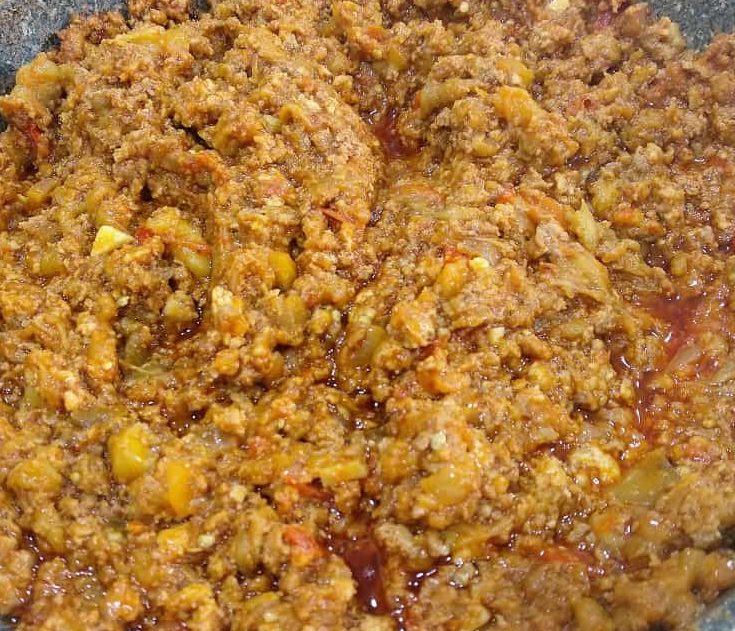 • Incorporamos la carne de la berenjena y la carne picada, remuévela bien para que la carne no se apelmace.