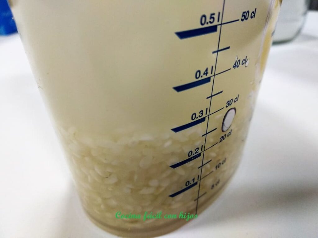 - Lo primero es hacer nuestra propia harina de arroz:Ponemos el arroz sin cocer en un bol, añadimos el agua, lo tiene que cubrir totalmente. Y lo dejamos a remojo durante 8 horas.