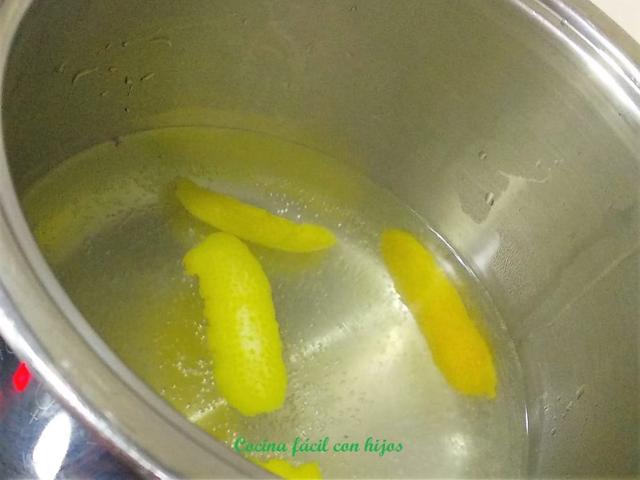 - Lo primero es con ayuda de un pelador o un cuchillo, quitar dos o tres tiras de la cáscara del limón (con cuidado de que no vaya la parte blanca) y ponerlo en el agua, lo llevamos a ebullición y lo infusionamos.