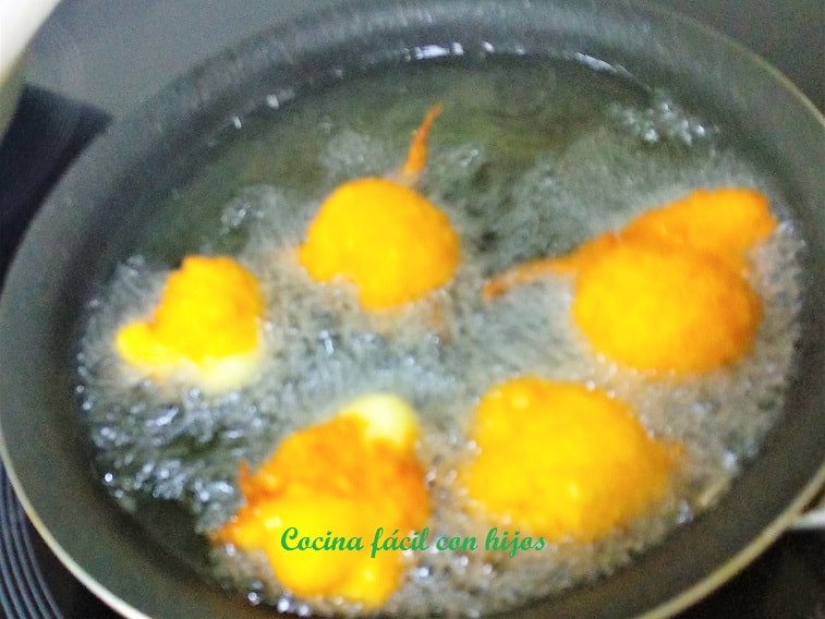 - Ponemos una sartén al fuego, con abundante aceite (el suficiente para que los buñuelos floten en él).