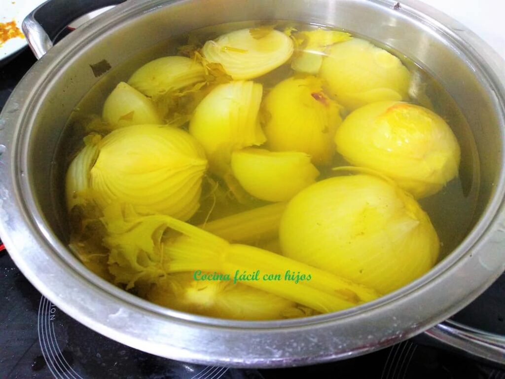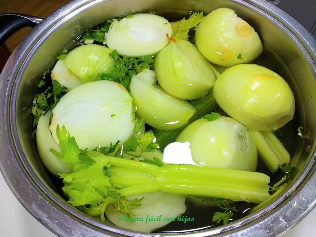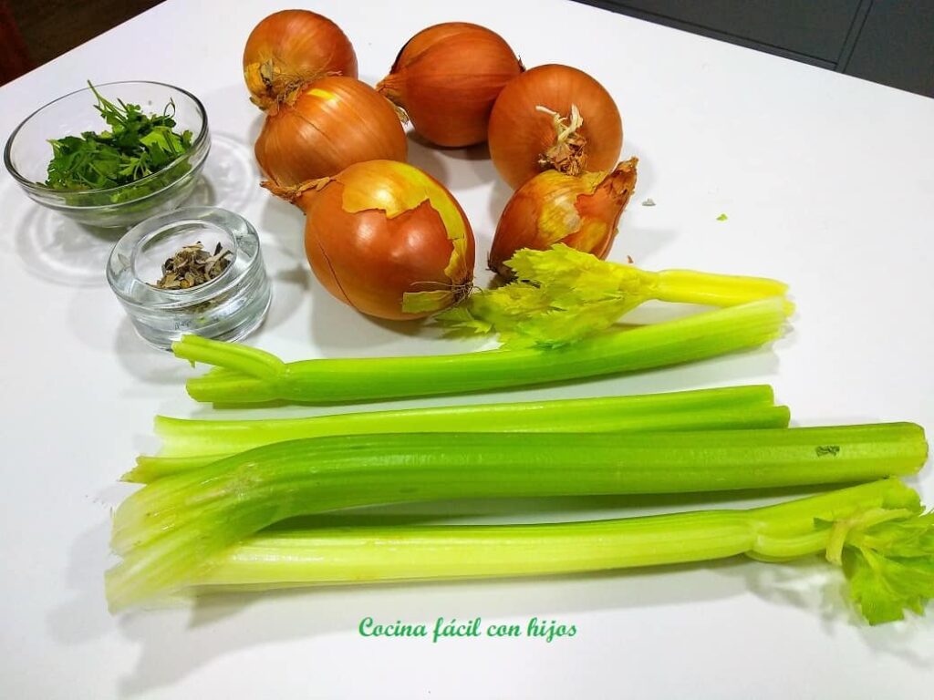 • Pelamos las cebollas, limpiamos el apio y el perejil.