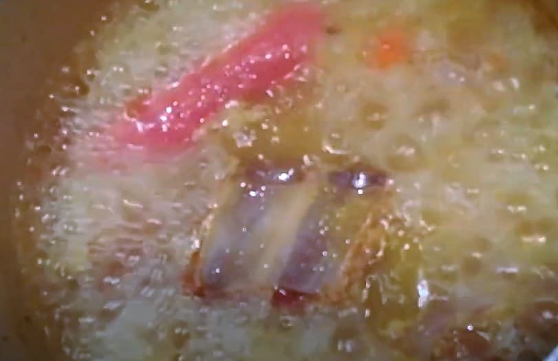 • Ponemos en la cacerola el agua, la carne, la gallina, los huesos y el tocino (lavados bajo el grifo), y sal al gusto. Lo llevamos a fuego vivo. Cuando empieza a hervir quitamos la espuma.