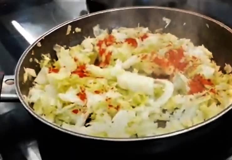• Laminamos los ajos y los freímos en una sartén con un chorrito de aceite de oliva. incorporamos el repollo y lo sofreímos, terminamos espolvoreándolo pimentón, le damos una vuelta y lo sacamos del fuego.