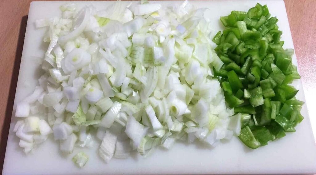 • Picar el diente de ajo, la cebolla y el pimiento