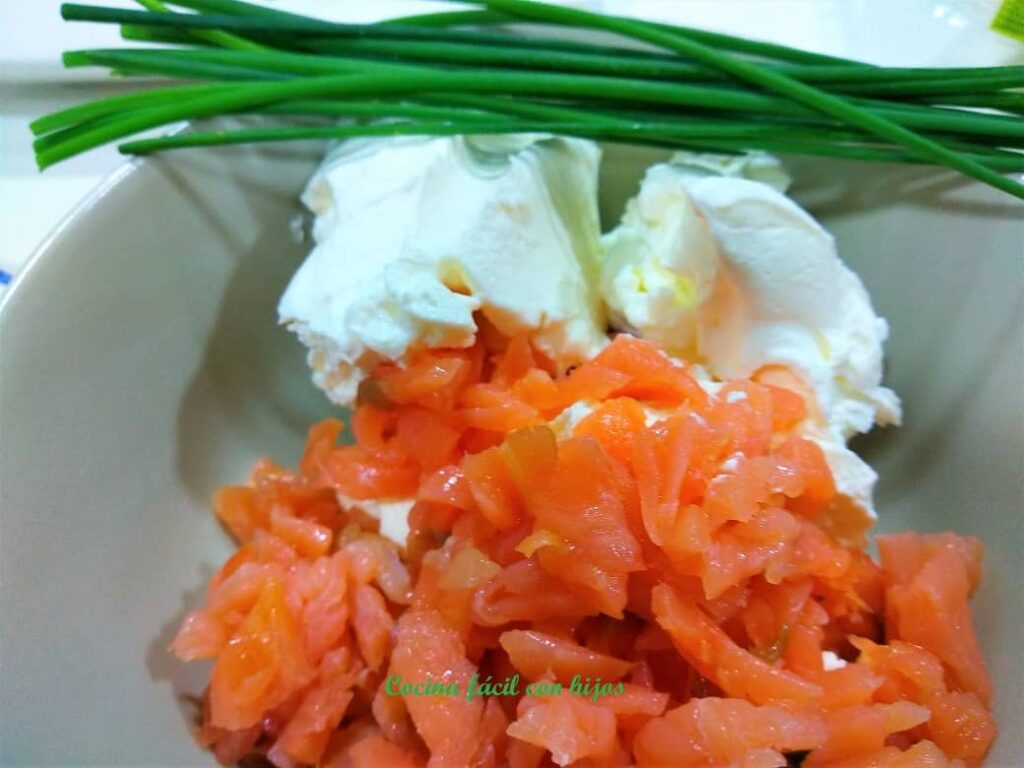 • Picamos el cebollino y el salmón finito, con unas tijeras, y lo añadimos al bol.