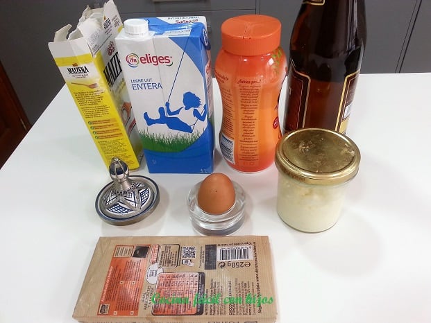 - Cuando está fundido lo echamos en el vaso de la batidora, añadimos la leche, la maicena, el huevo, el azúcar, el ron y la sal. Batimos, a velocidad máxima, hasta tener una mezcla homogénea.