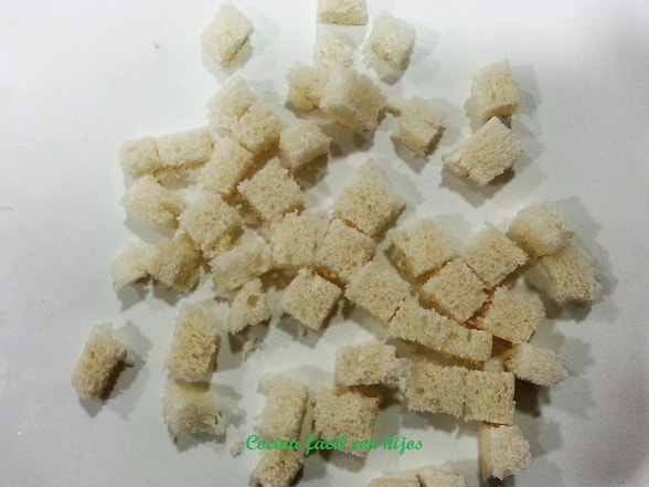 • Los hago cortando en cuadraditos una rebanada de pan de molde, los doy un par de vueltas en una sartén con aceite y los dejo sobre papel absorbente, para retirar el exceso de aceite.