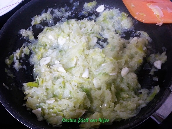 • Cuando empieza a estar transparente añadimos el puerro también cortado finito y continuamos cocinándolo, en el último momento añadimos los ajos cortados en láminas y damos un par de vueltas más al sofrito.