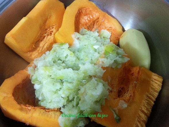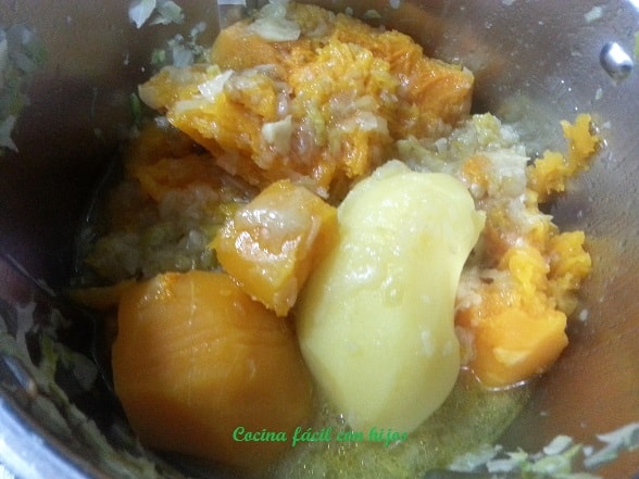 • En una olla ponemos la calabaza, la patata y el sofrito, añadimos agua suficiente para cubrirla y sal.