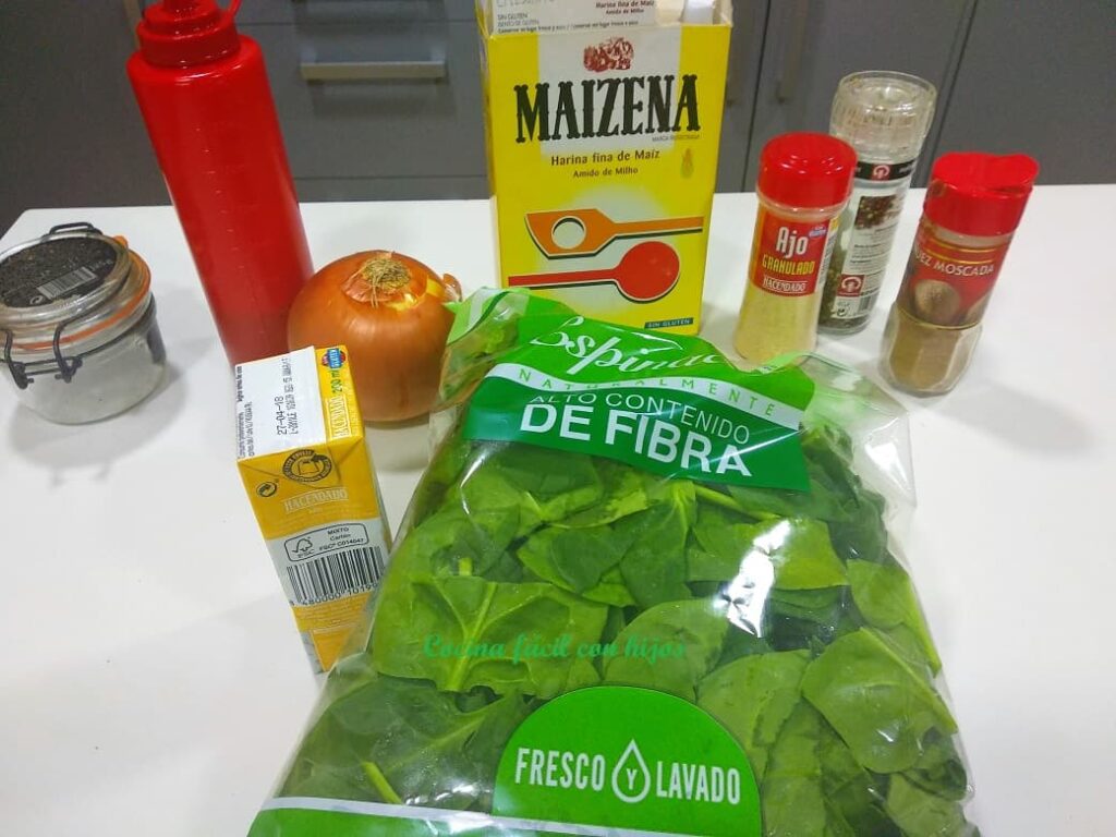 Los ingredientes básicos de esta receta son las espinacas con una base de bechamel ligera. Puedes hacer la receta con espinacas frescas o con espinacas congeladas y cambiar los ingredientes según tus gustos o necesidades.