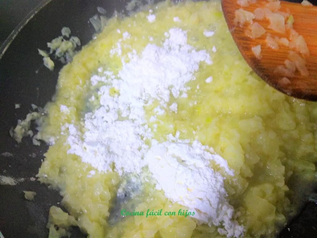• Añadimos la maicena y la cucharada de mantequilla. Damos vueltas con una cuchara de madera y la tostamos durante 1 minuto a fuego medio.