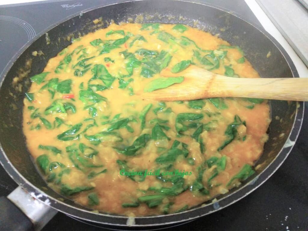 • Incorporamos la leche y seguimos moviendo con la cuchara de madera. Cuando la harina está disuelta incorporamos las espinacas.