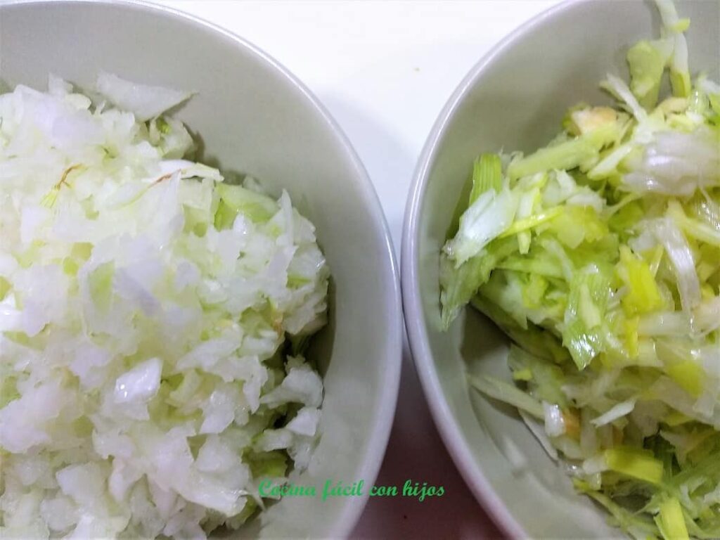 - Picamos finita la cebolla y el puerro y los dejamos en una sartén con aceite de oliva caliente para pocharlos, a mitad de cocción añadimos sal.