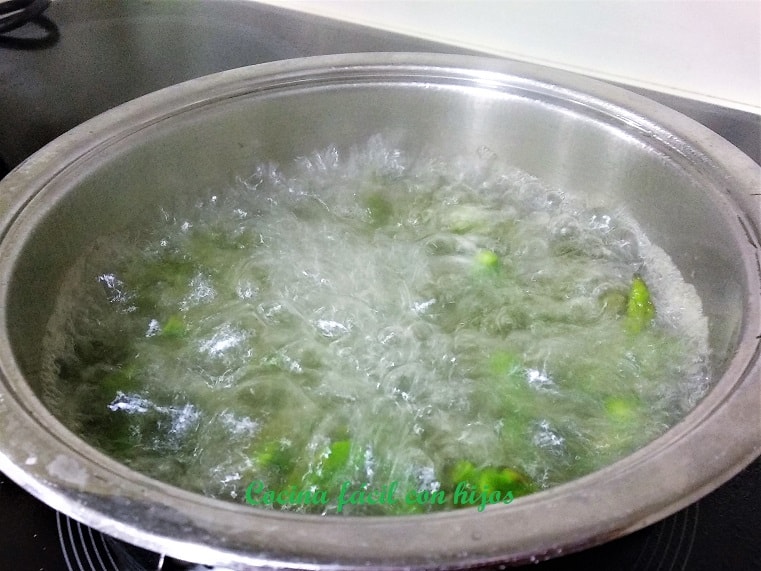 - En un cazo pequeño ponemos agua con un poquito de sal. Cuando esté hirviendo echamos las yemas de los espárragos y las cocemos durante 4 o 5 minutos (dependiendo del grosor) hasta que están al dente.