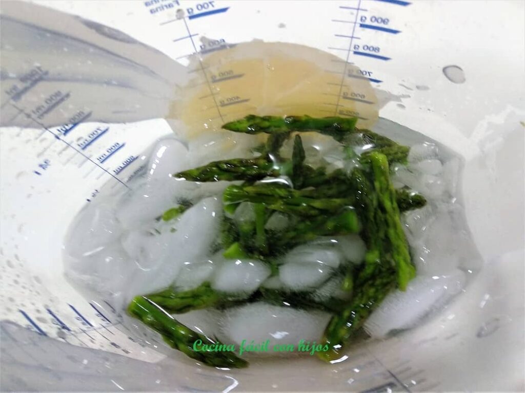 - Los retiramos y los introducimos en un bol con agua y hielo para que se interrumpa la cocción y no se pasen. Escurrimos, reservamos y dejamos que se sequen.