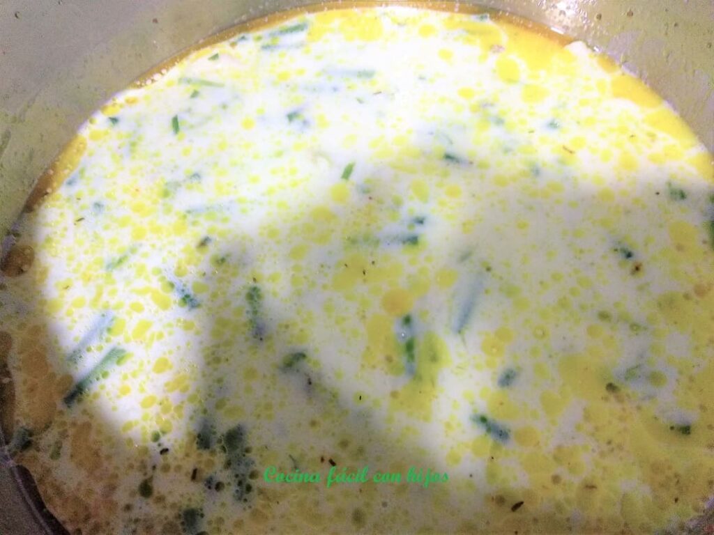 - Pasado este tiempo agregamos la leche y el caldo de pollo ó de verduras y el agua de cocer las yemas de los espárragos, y cocemos durante 20 m., a fuego suave.