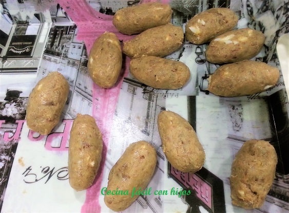 - Cuando ya está la masa bien fría, damos forma a las croquetas con un par de cucharas, las rebozamos con huevo batido y las pasamos por pan rallado. En ese momento están listas para freírse.