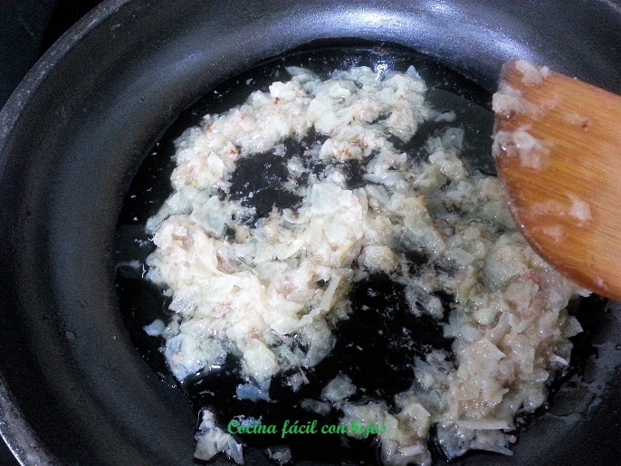 - Ponemos en una sartén aceite, lo llevamos a fuego medio y cuando el aceite esté caliente añadimos la cebolla, que previamente hemos cortado en cuadraditos. Pochamos la cebolla.