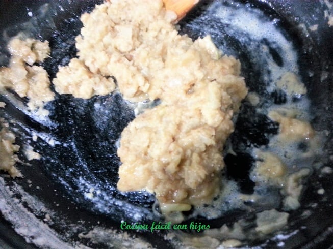 - Incorporamos la carne de cocido. Seguimos moviéndolas hasta que la mezcla se despegue de las paredes de la sartén y se forme una masa espesa.