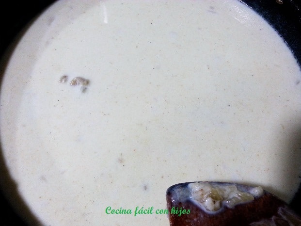 - Incorporamos la leche seguimos moviendo con la cuchara de madera. Cuando la harina está disuelta. Se deja cocer en fuego medio y cuando empieza a hacer burbujas, bajamos un poco el fuego.