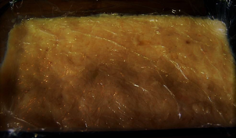 - Ponemos la masa en una fuente de cristal y la cubrimos con papel film, para que no se forme corteza