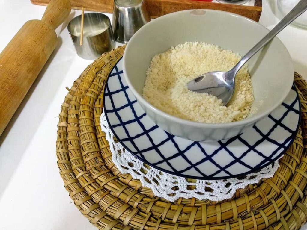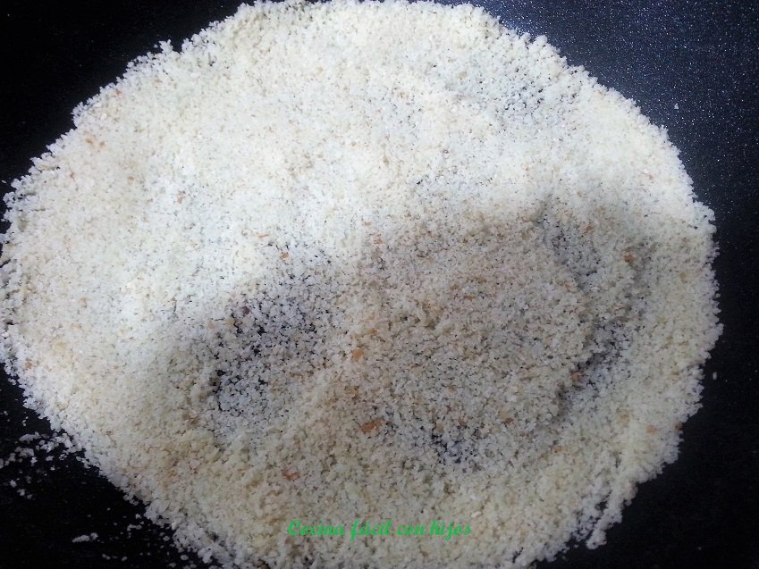 Para elaborarlo tenemos que usar un queso maduro: manchego, parmesano, grana padana…, es decir un queso con cuerpo, que vamos a utilizar rallado. A este queso le vamos a añadir un poquito de pan rallado y pimienta, puedes utilizar otras especias que te gusten: pimentón, orégano, ajo en polvo…