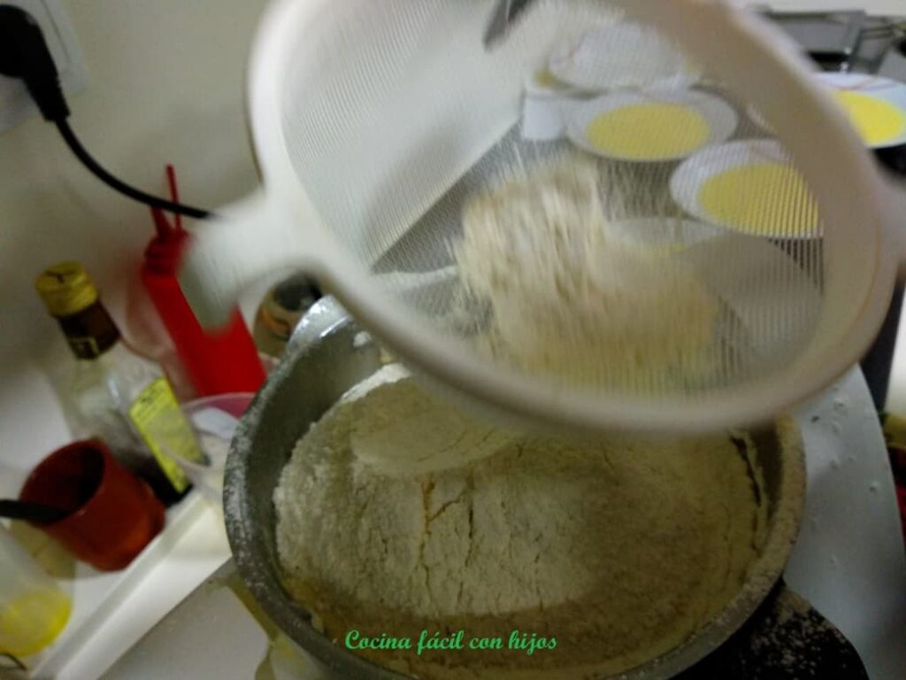 - Tamizamos la harina sobre este recipiente, añadimos la sal. Y con una batidora, mezclamos hasta que la masa se una. Suele tardar cinco minutos.