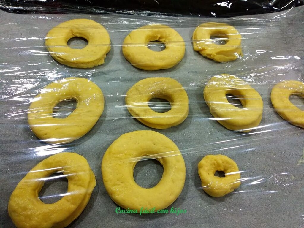 - Vamos depositando los donuts en la bandeja y lo tapamos con papel film, los dejamos reposando durante 1 hora aproximadamente.