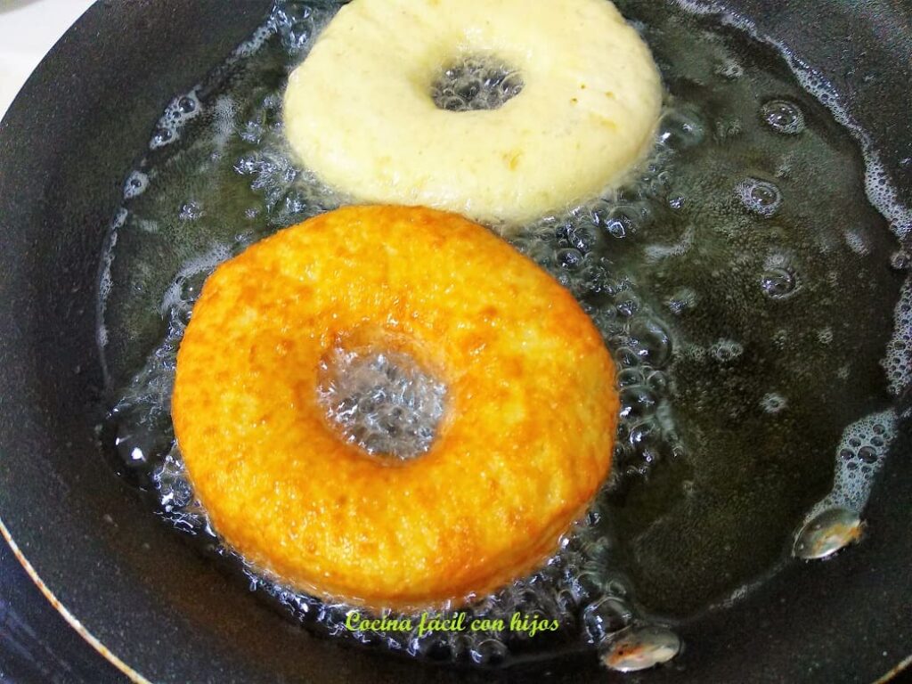 - Ponemos en una sartén unos 3 cm. de aceite a fuego medio bajo y vamos añadiendo los donuts para freírlos, hasta que estén dorados.