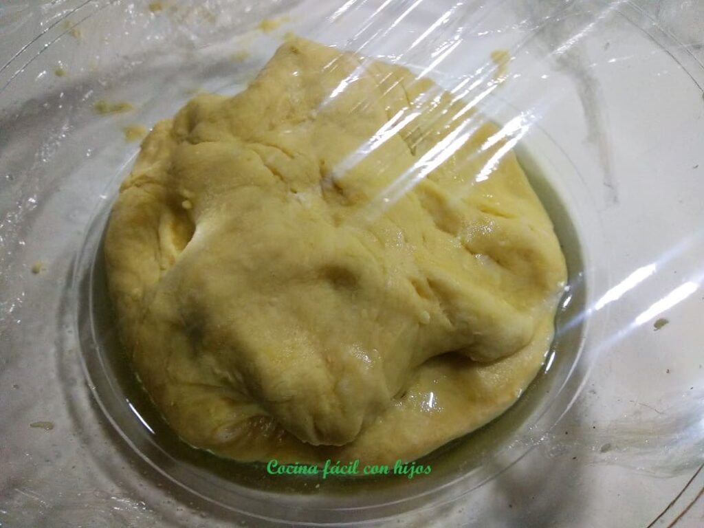 - La metemos en un bol (que previamente hemos untado con aceite de girasol). El bol tiene que ser lo suficientemente grande para que pueda crecer, lo tapamos con papel film y lo dejamos a temperatura ambiente (27º o 28º) durante 1 hora y 30 minutos. Si hace más frío necesitará más tiempo y si hace calor menos.