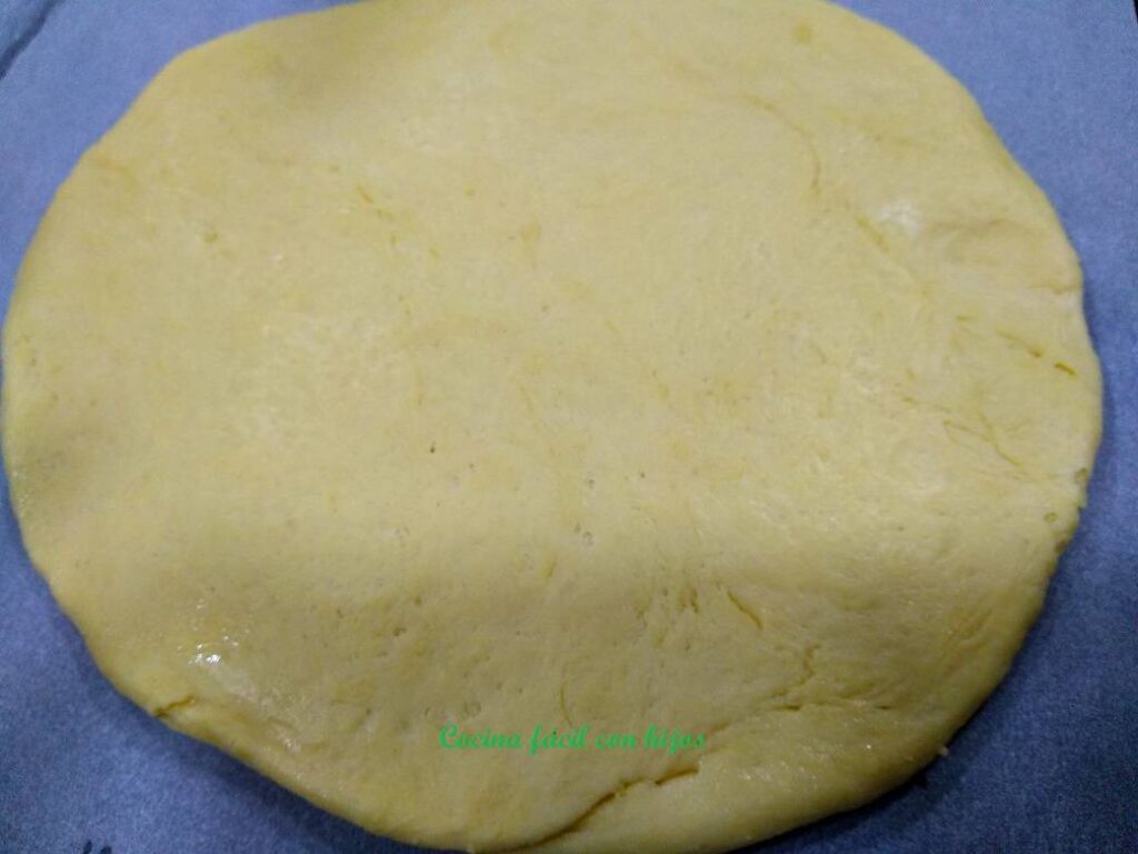 - Ponemos la masa en una bandeja con papel de horno debajo y la extendemos con ayuda de un rodillo hasta que la dejamos de 1 cm de grosor.