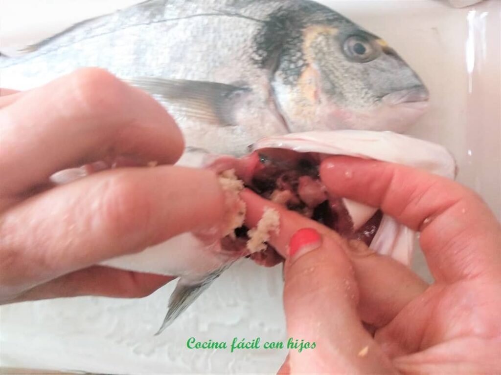 • En el hueco que han dejado las tripas mete una buena cantidad de miga de pan, para evitar que la sal se introduzca dentro del pescado.