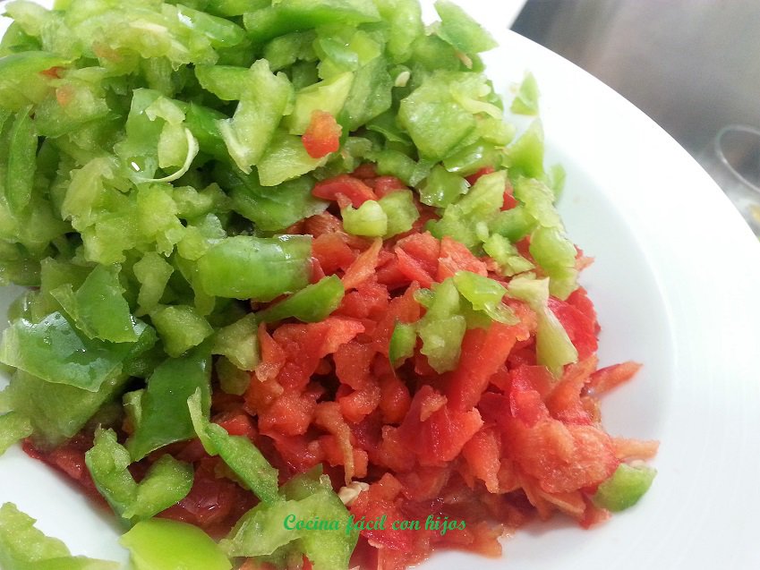 - Cuando la cebolla está empezando a ponerse tierna añadimos los pimientos y dejamos que se vayan pochando.