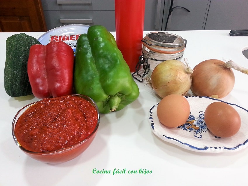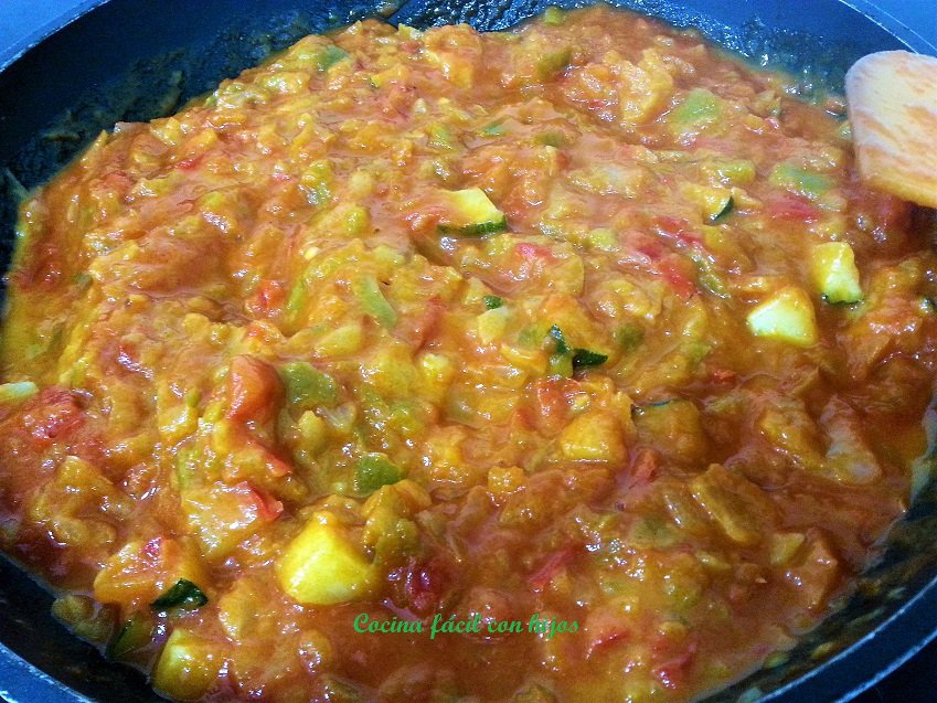 - En la sartén añadimos el calabacín, el tomate frito y rectificamos de sal. Lo dejamos a fuego lento 10 minutos aproximadamente.