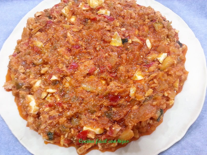 Entonces uno deja que se repose y luego ya hecho, lo reparto y voy echando según de lo que sea la empanada; bonito, o pulpo, o carne…