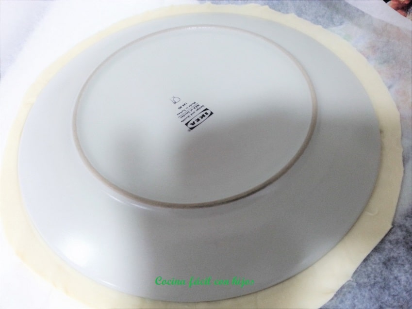 - Extendemos la otra lámina de hojaldre y con ayuda de un plato cortamos un trozo, para dejarla más pequeña que la base, y aprovechamos las tiras para decorar la empanada.