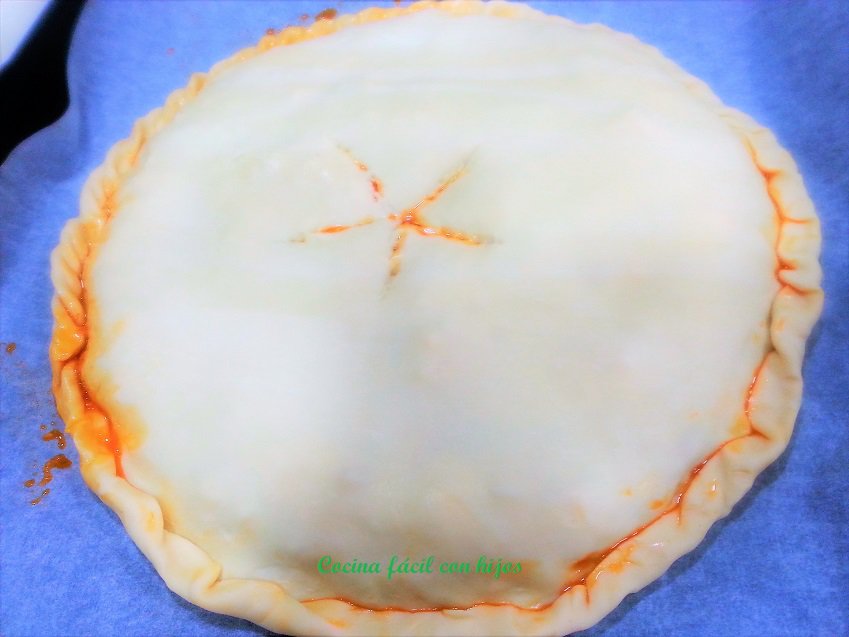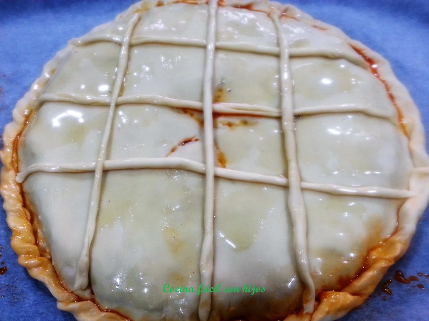 - Con las tiras del recorte hacemos un canutillo y las colocamos encima como adorno. Pincelamos la empanada con clara de huevo batida o con aceite de oliva.