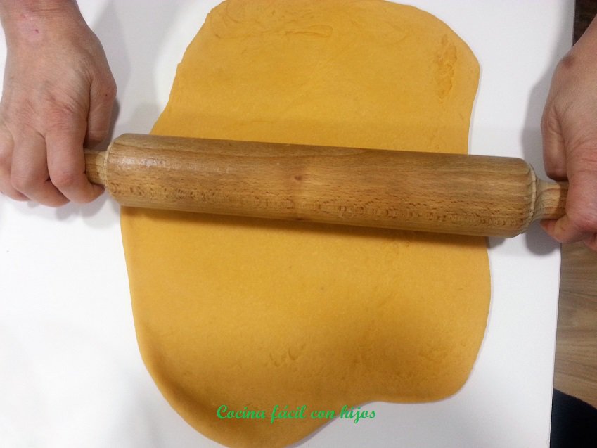 - Ponemos la masa sobre papel de horno, se estira sobre él, con ayuda del rodillo. Procurando que quede muy fina.