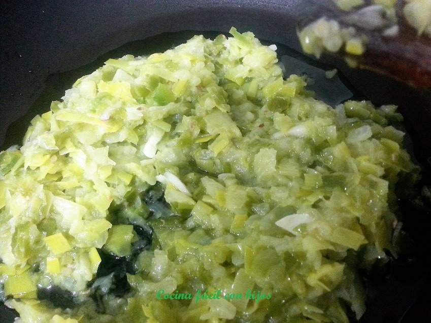 - Cuando la cebolla está transparente, echamos los pimientos y los puerros.
